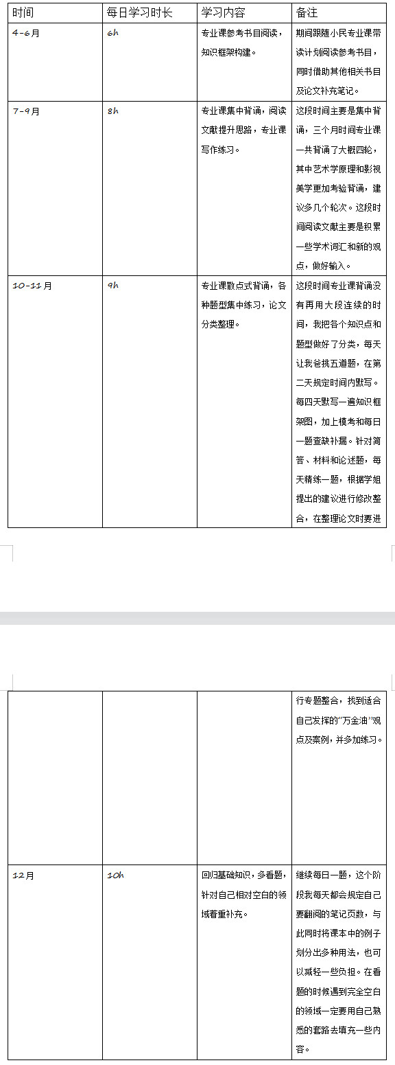 (1)专业课一632:相较于840来说,学习专业课一需要更加重视对于专业知识脉络的熟悉和要点的背诵,在学习背诵的过程当中以艺术学原理和影视美学为重点,认知阅读背诵笔记,并在笔记上补充自己运用熟练的相关例子。艺术学原理对我来说有点难记清楚,总是会漏掉要点,所以我在学习的时候会以每一个要点为发散,在自己积累的素材库当中寻找自己熟悉的例子,再倒回去用例子去记忆知识点,大家也可以在学习过程中去寻找适合自己记忆的方式,无论是用例子记还是自己编顺口溜都可以。艺术学原理是需要死记硬背的,所以会有一点枯燥,需要自己耐住性子一遍一遍加深记忆。影视美学相对来说更加偏向理解记忆,笔记上面的例子也更多,会更加有意思一点。背诵的时候,我是先按目录背诵增加轮数加深记忆,同时按照时间顺序做了一个时间轴,将影史的重要事件、作品以及观点标注清楚,会更加有利于自己记忆,同时也能够对于影视美学理论的发展有更加清晰的认知,方便知识迁移。