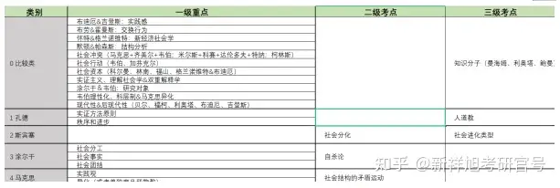 九月底我确定了以人大为目标学校,对西方社会学的一轮学习也结束了,因此后续的二轮复习是以复述思想家的理论+看真题+其他题库练习题为策略的,具体做法是我按照理论的复杂程度确定了复习时长(例如舒茨的理论我一般一天结束,但是帕森斯的我会花三天时间),同时按照流派(功能论、冲突论等)对23位思想家做了分类,一个专题、一个专题的去复习理论。这个阶段我一方面完成了理论的背诵(不需要逐字逐句,以框架完整、内容核心正确为目标),并且眼熟了大部分题目的考察方法和真题偏好,整理了如下的表格,为后续三轮做好了准备。