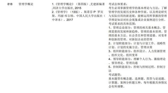官方的教材是尤建新的《管理学概论》和罗宾斯的《管理学》, 自命题的考 试大纲也在官网公示。除此之外,我用到的教辅是“天道酬勤同济 818 管理学 考研”的资料。暑假期间,我将教材过了一遍,但是我是个不太会抓重点的人, 因此,选择依赖于资料的复习能够帮我提高效率。9 月份开始主要就是背诵天 道酬勤团队里学长学姐总结的资料,在背诵过程中遇到不太理解的地方再回归 教材。按我的经验,背诵的越多越熟越好,这一门考试的答题技巧类似于考研 政治,只有精准压在考点上结合已知题干才能够得分,单纯的默写得分不会很 高。除了背诵,刷题也能够很好的巩固知识点,建议背完一章知识点,做相应 的选择、判断题。历年真题都是回忆版,但是可以根据例题,和学长学姐的总 结,归纳出一份自己的答题模板,帮助自己在答题时更有条理。