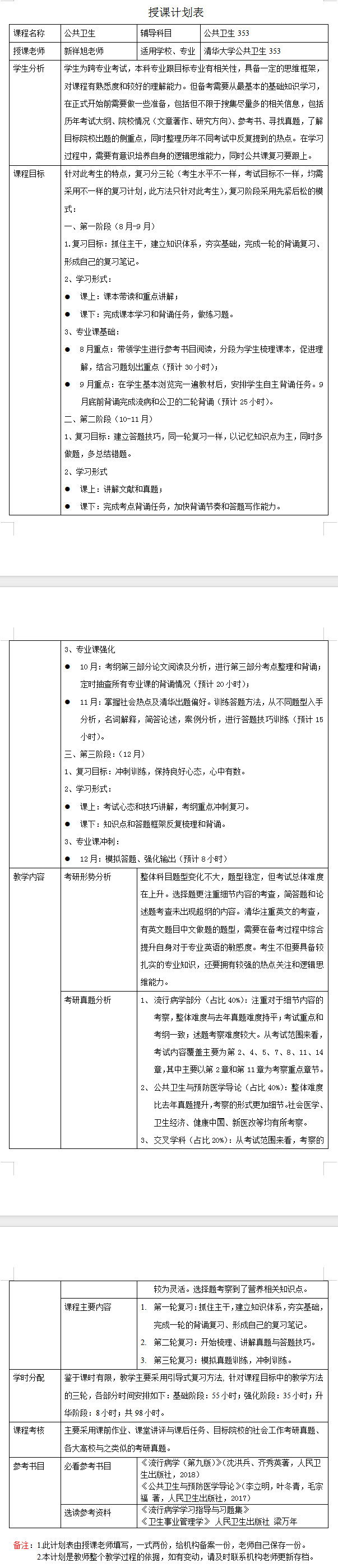 新祥旭考研:2024年清华大学公共卫生专业考研一对一辅导授课计划