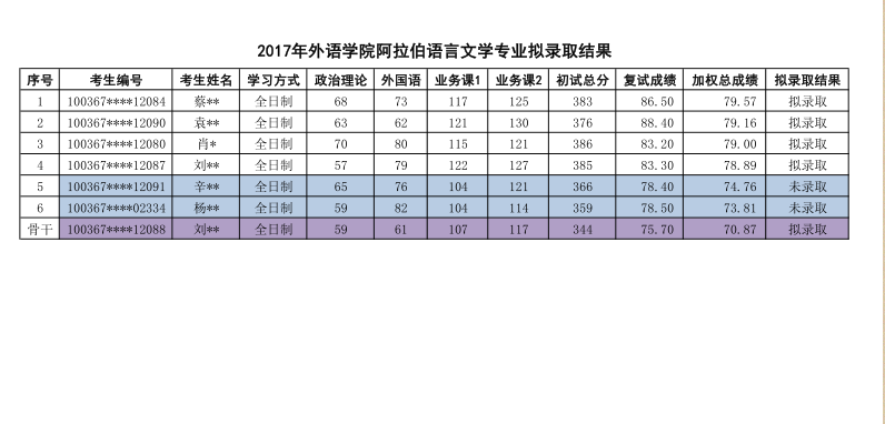 2017年对外经济贸易大学阿拉伯语语言文学研究生拟录取名单