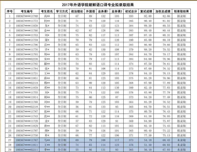 2017年对外经济贸易大学朝鲜语口译研究生拟录取名单
