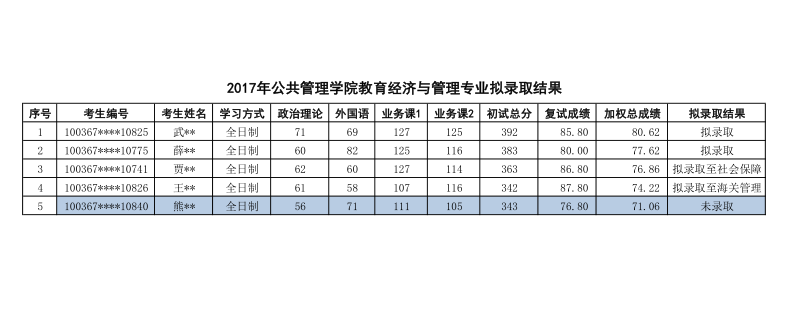 2017年对外经济贸易大学教育经济与管理研究生拟录取名单