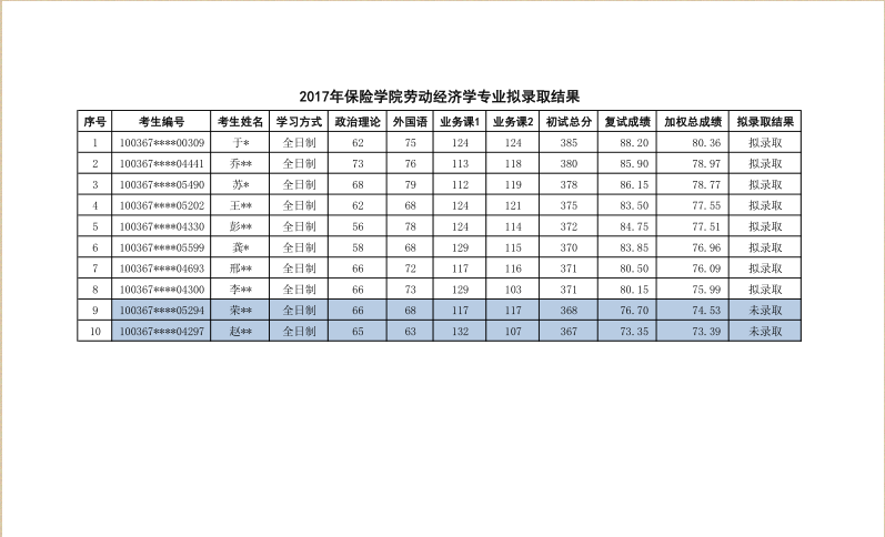 2017年对外经济贸易大学保险学院劳动经济学研究生拟录取名单