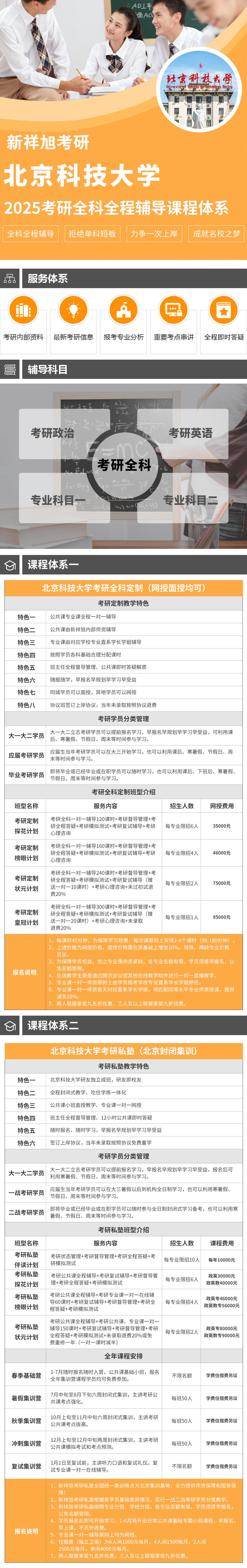 新祥旭考研机构开设有北京科技大学考研私塾课程,北京科技大学考研私塾为北京科技大学考研学子提供专属的封闭式集训学习环境,考研私塾全程封闭式教学、吃住学练一体化;公共课小班面授教学(PS:若公共课某科特别弱亦可单独再另咨一对一针对性补习)、专业课一对一面授或网授;班主任全程督导管理、公共课专业课即时免费答疑。考研学员随报随学,专业务实,真诚周到,助力上岸!
