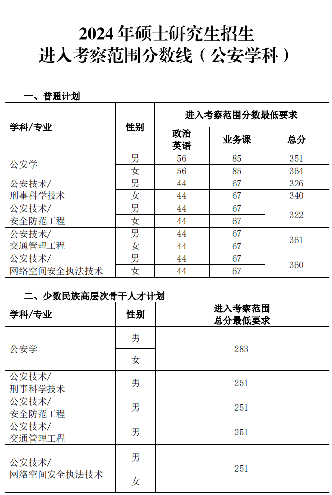 中国人民公安大学2024年硕士研究生招生进入考察范围分数线(公安学科)