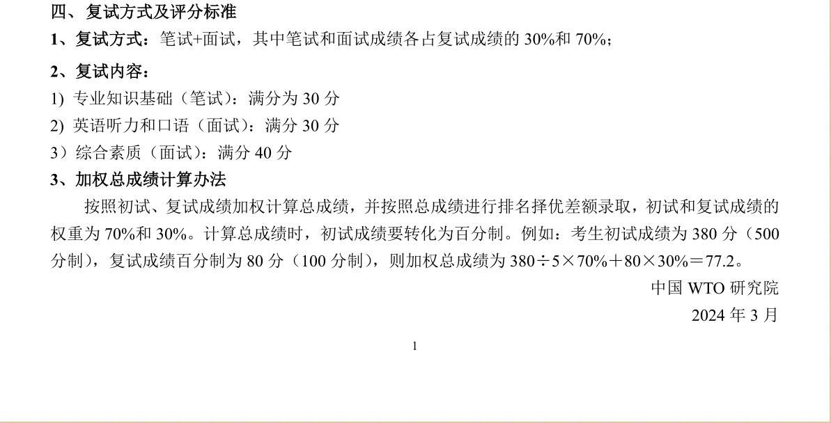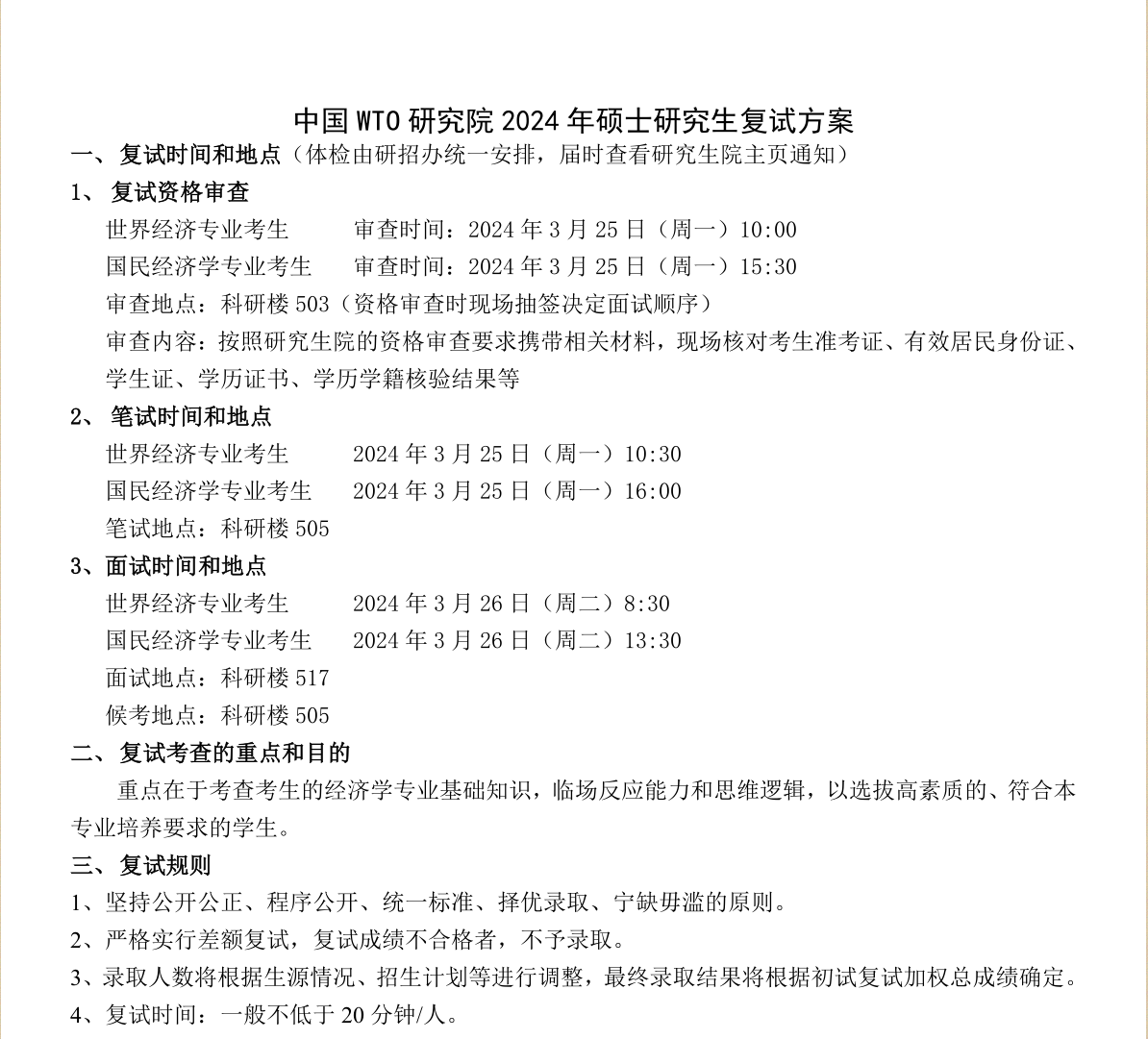 对外经济贸易大学中国WTO研究院2024年硕士研究生招生考试复试方案
