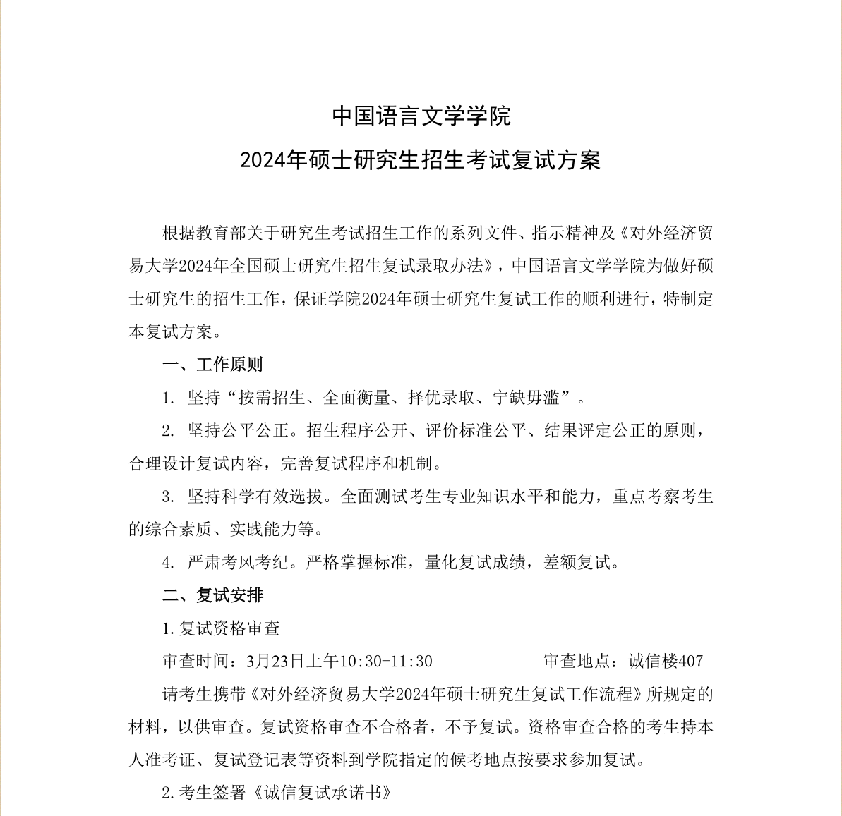 对外经济贸易大学中国语言文学学院2024年硕士研究生招生考试复试方案