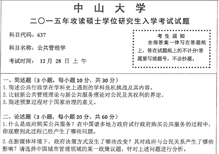 中山大学公共管理专业2014-2016年考研真题