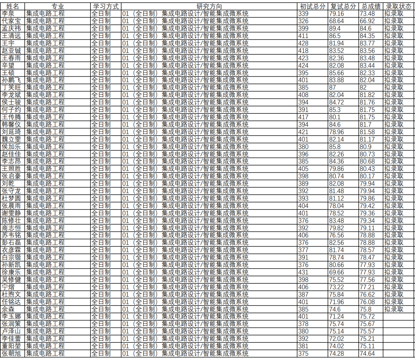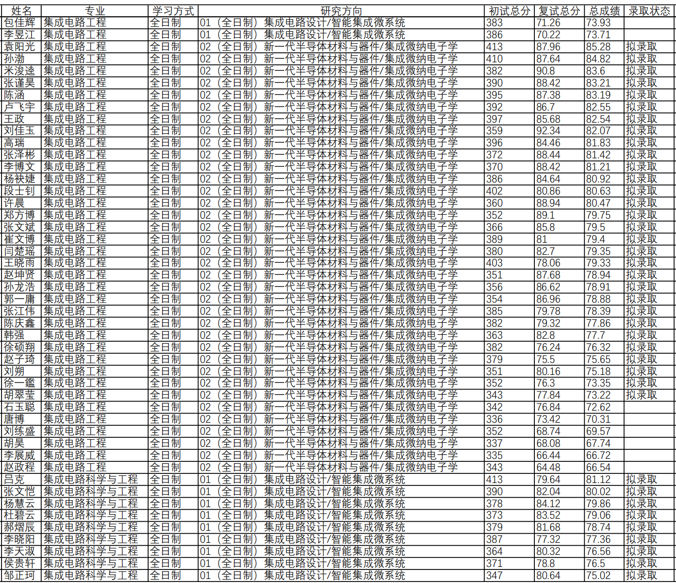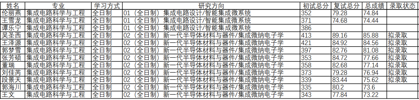 (二)集成电路工程:分方向依照总成绩由高到低依次录取(总成绩=初试成绩(满分500分)/5*50%+复试成绩*50%)。