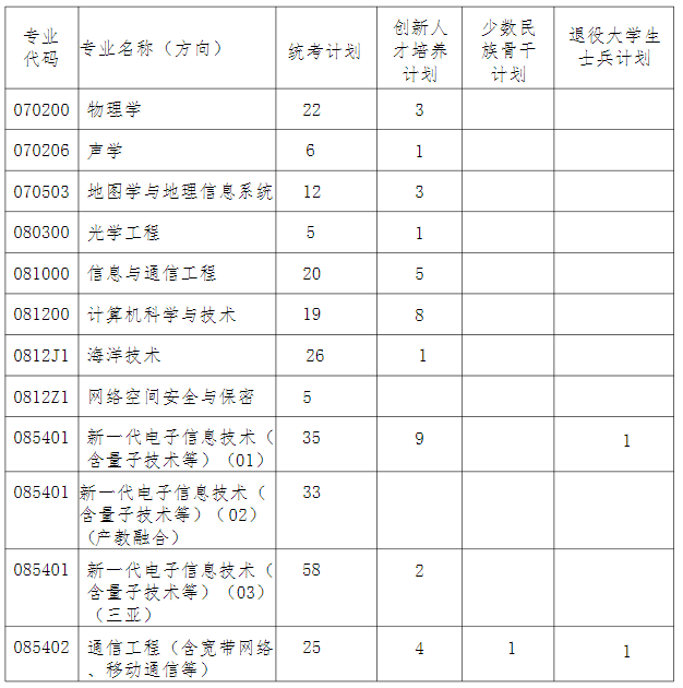 4、070503地图学与地理信息系统、070206声学、0812J1海洋技术、085401新一代电子信息技术(含量子技术等)(03方向三亚海洋研究院计划)、085407仪器仪表工程(含01方向、02产教融合方向)、085704测绘工程