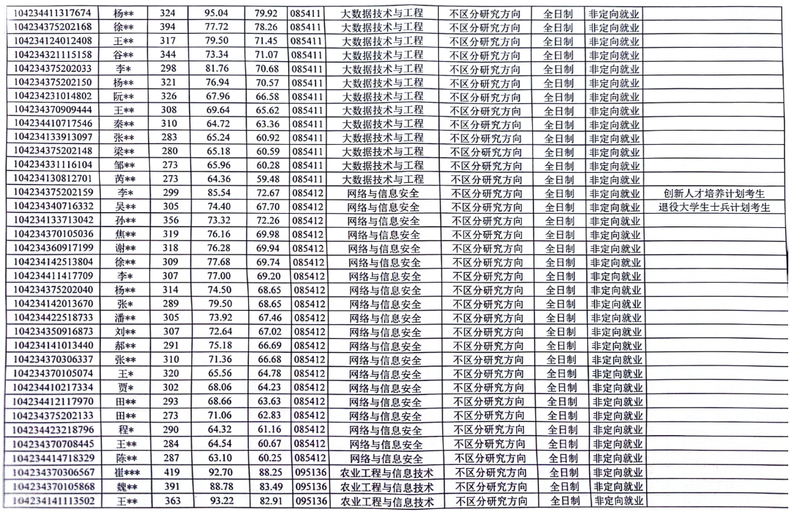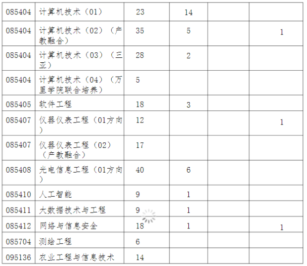 1、081200计算机科学与技术、0812Z1网络空间安全与保密、085404计算机技术(含01方向、02产教融合方向、03三亚产教融合方向、04万里学院联合培养计划)、085405软件工程、085410人工智能、085411大数据技术与工程、085412网络与信息安全、095136农业工程与信息技术。