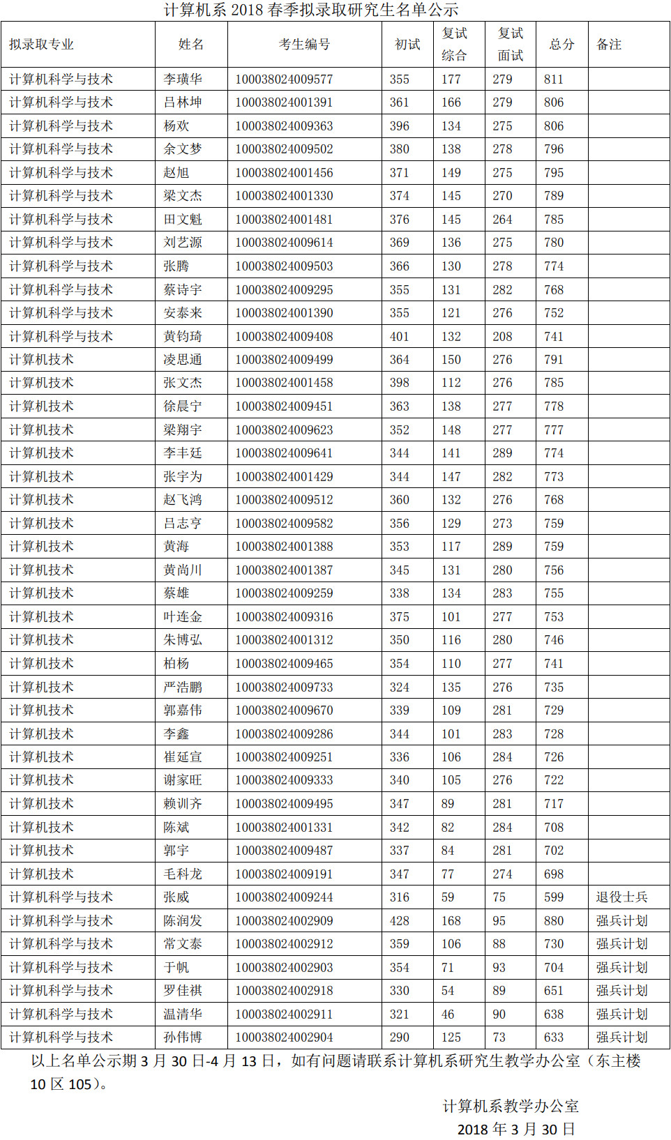 清华大学计算机科学与技术系2018年硕士研究生拟录取名单