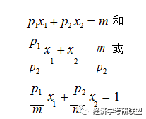 是同一条预算线的不同表达形式, 因为第二式只是第一式左右两侧同除以p2 ,第三式是第一式左右两侧同除以m 。在第二个式子中,我们将p2 固定为1;在第三个式子中,我们将m 固定为1。将其中一种商品价格或者收入固定为1,相应调整其他商品的价格或收入不会改变预算集。