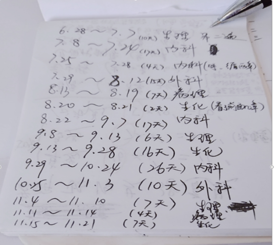 从图中可以看出第二轮复习开始后,内科我是复习了三遍,前两遍都是17天,最后一次是26天,其中重点难懂的呼吸和循环章节我是又花了四天时间专门看它。外科我是看了两遍,分别是15天和10天。第二轮复习我主要是看我的辅导讲义,不懂的翻书或者看贺银成视频,还有最最重要的,我每天不仅单纯的看书,因为单纯的看书其实效率很低的,你以为你都记住了,书一合你全都忘了,所以我在手机上每天都有看真题,具体的什么app大家应该都知道,而且有几个类似的app呢,大家无论选哪个都可以,真题我是认认真真看的,而且除非特别简单的知识点,遇到有些我认为我自己可能不会的我都把它记下来,一个知识点一个知识点的记下来,记在小本子上,因为小本子你可以随时随地带着,吃饭前,睡觉前,这些琐碎的时间都可以利用起来,真题我是做了至少三遍,有的章节我会重复做好几遍。因为app很方便,可以做完清除掉再做一遍,遇到不会的就翻我的小本子,感觉从真题里学到了很多知识点。在这期间大家可以看到我把生理生化穿插在其中复习了一遍。