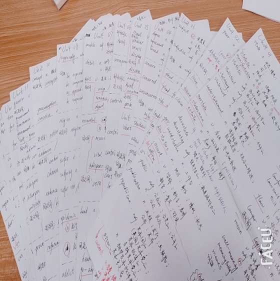 具体来讲,我认为英语单词很重要,大多数同学单词可能跟着朱伟老师的《恋恋有词》,我觉得这得根据每个人的情况,我自己是不太喜欢把一整本书来回带着的,所以我把20个单元的单词分别抄在了A4纸上,大概就是每个单元一张纸,一开始不认识的单词比较多,所以是一天背一张纸,然后第二天早上先把前一天的那张纸复习一下,再开始下一张,之后背了一遍之后我就把每天背的张数增加了,就这样循环往复,直到考前,我认为单词不能扔掉,一扔掉阅读什么的就都不会了。下面就是A4纸上的单词