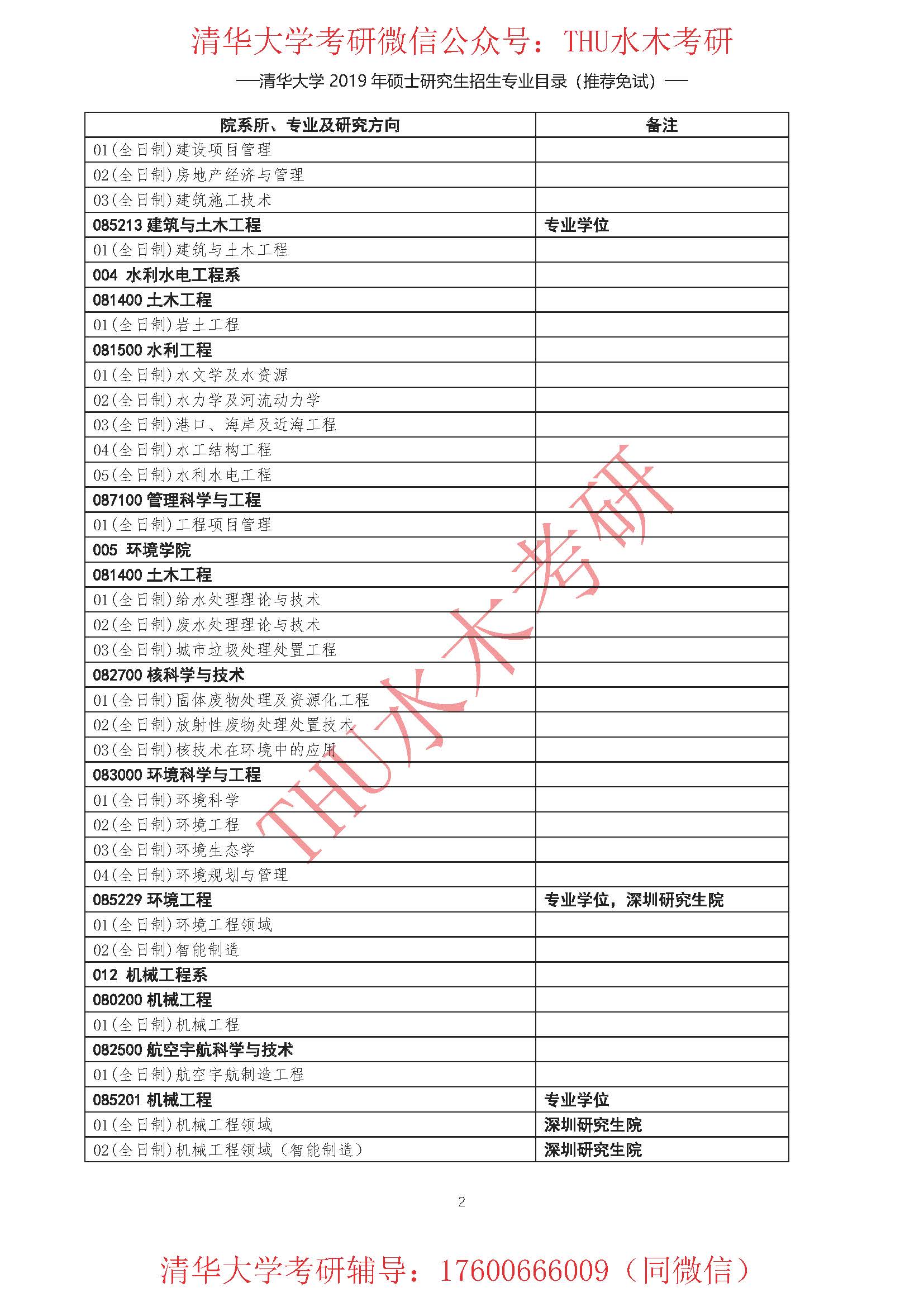 清华大学2019年硕士研究生推荐免试招生专业目录