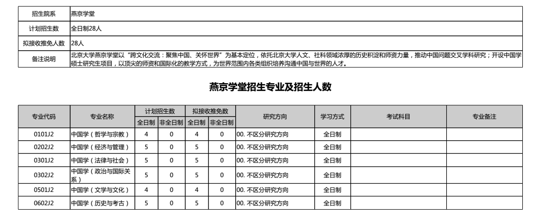 北京大学2019年燕京学堂研究生推免专业目录
