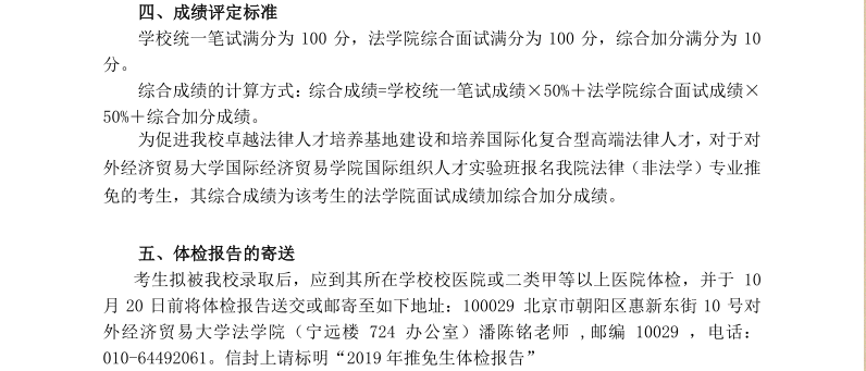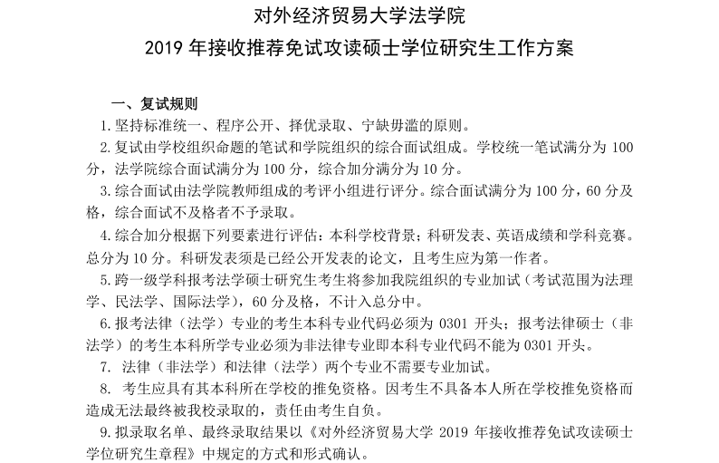 对外经济贸易大学法学院2019年接收推荐免试生复试工作方案