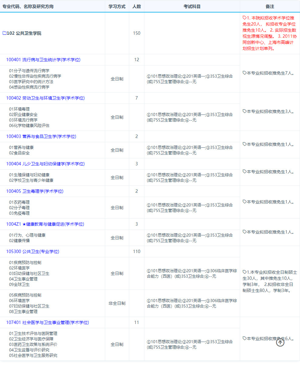 2019年复旦大学公共卫生学院考研招生专业、招生人数、考试科目