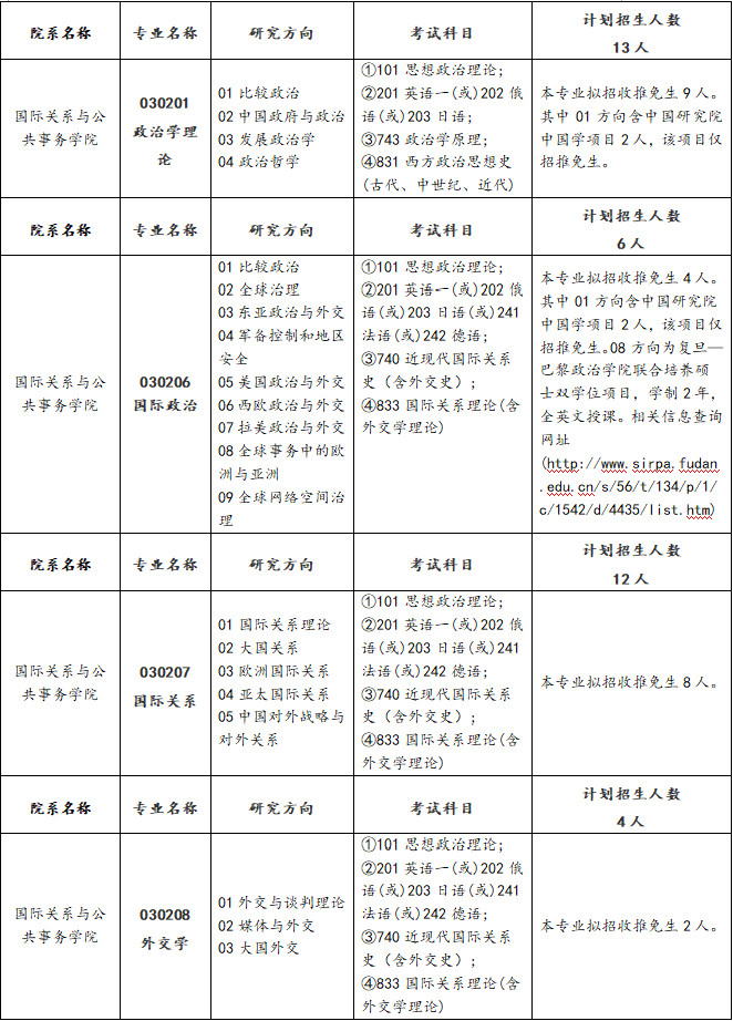 2019年复旦大学政治学学科招生计划人数及考试科目