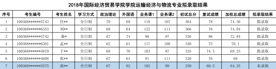 五、对外经济贸易大学国际经济贸易学院运输经济与物流专业研究生拟录取情况(2018年名单):