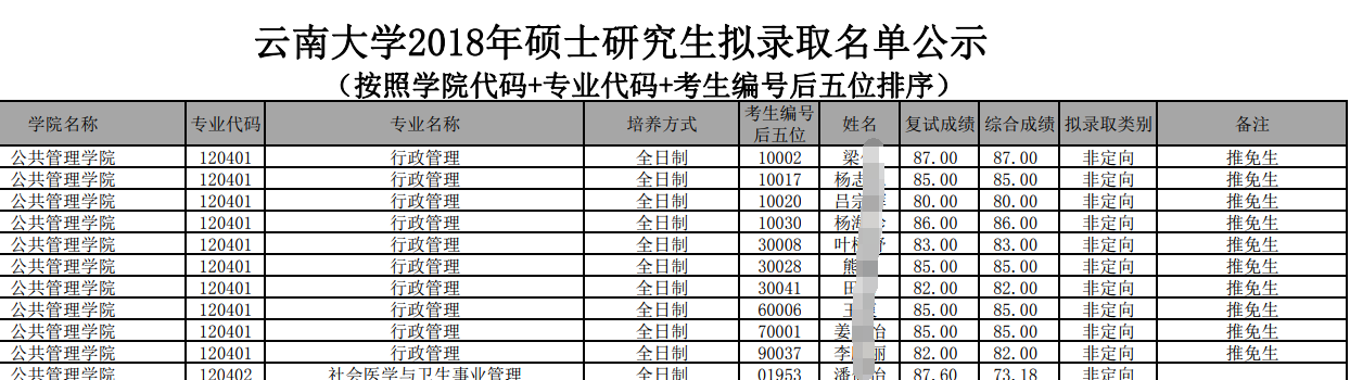 五、2018年云南大学行政管理考研录取名单