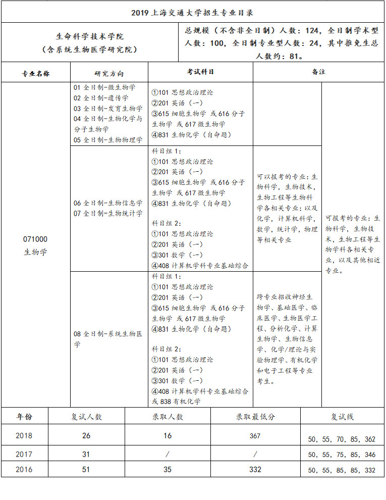 本文将系统的对上海交通大学生物学专业考研进行解析,主要有以下几个板块:学院介绍、专业介绍、近三年复试线、招生人数、考研科目介绍、考研参考书目及备考经验等几大方面。新祥旭考研丁老师(xinxiangxu123)将详细的为大家解答: