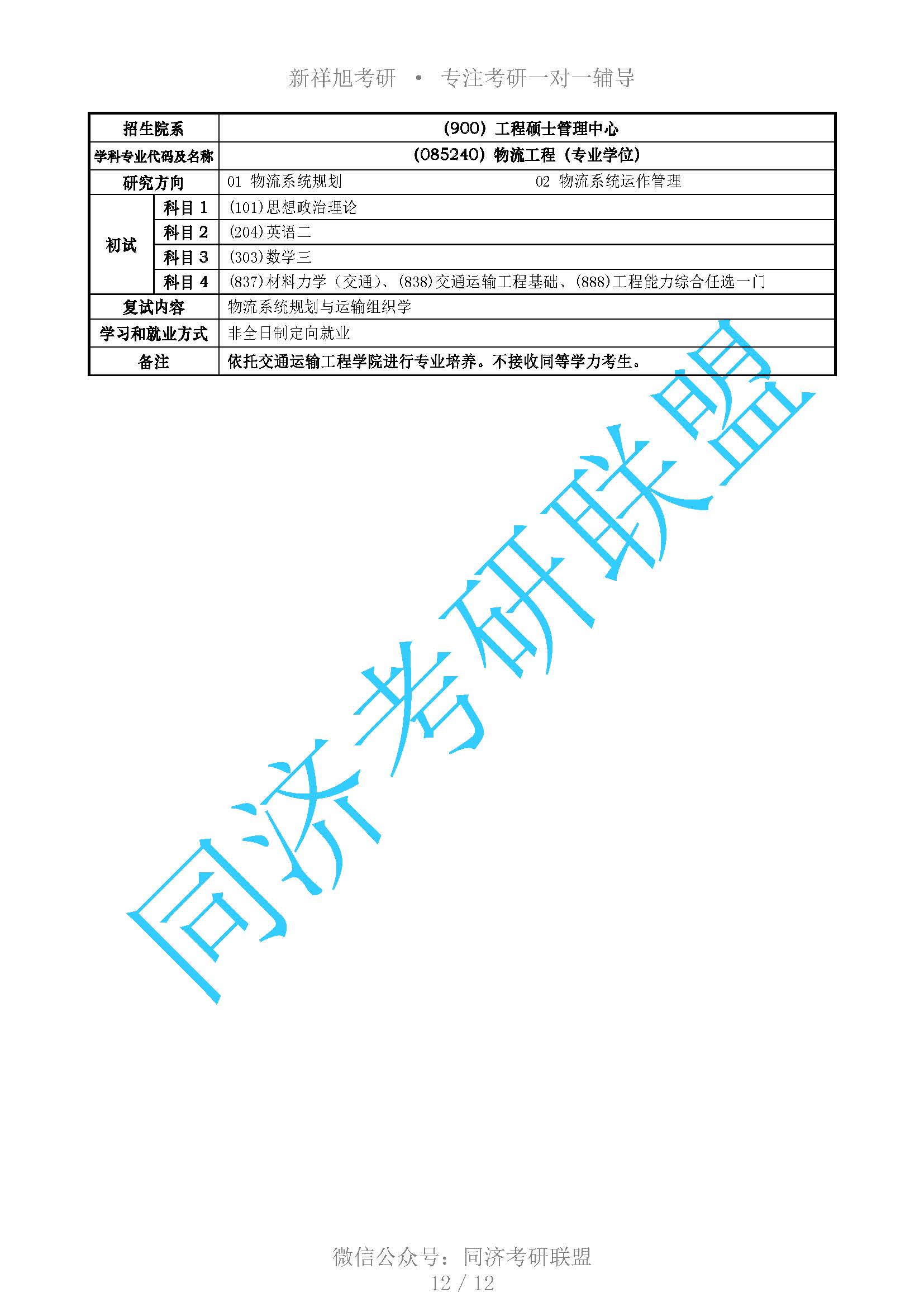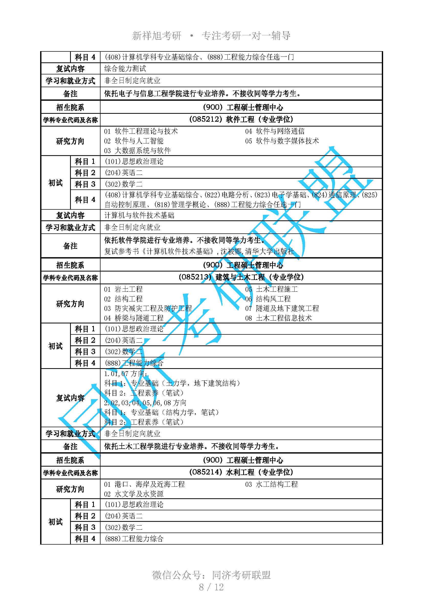 同济大学2019年专业硕士研究生招生专业目录、考试科目