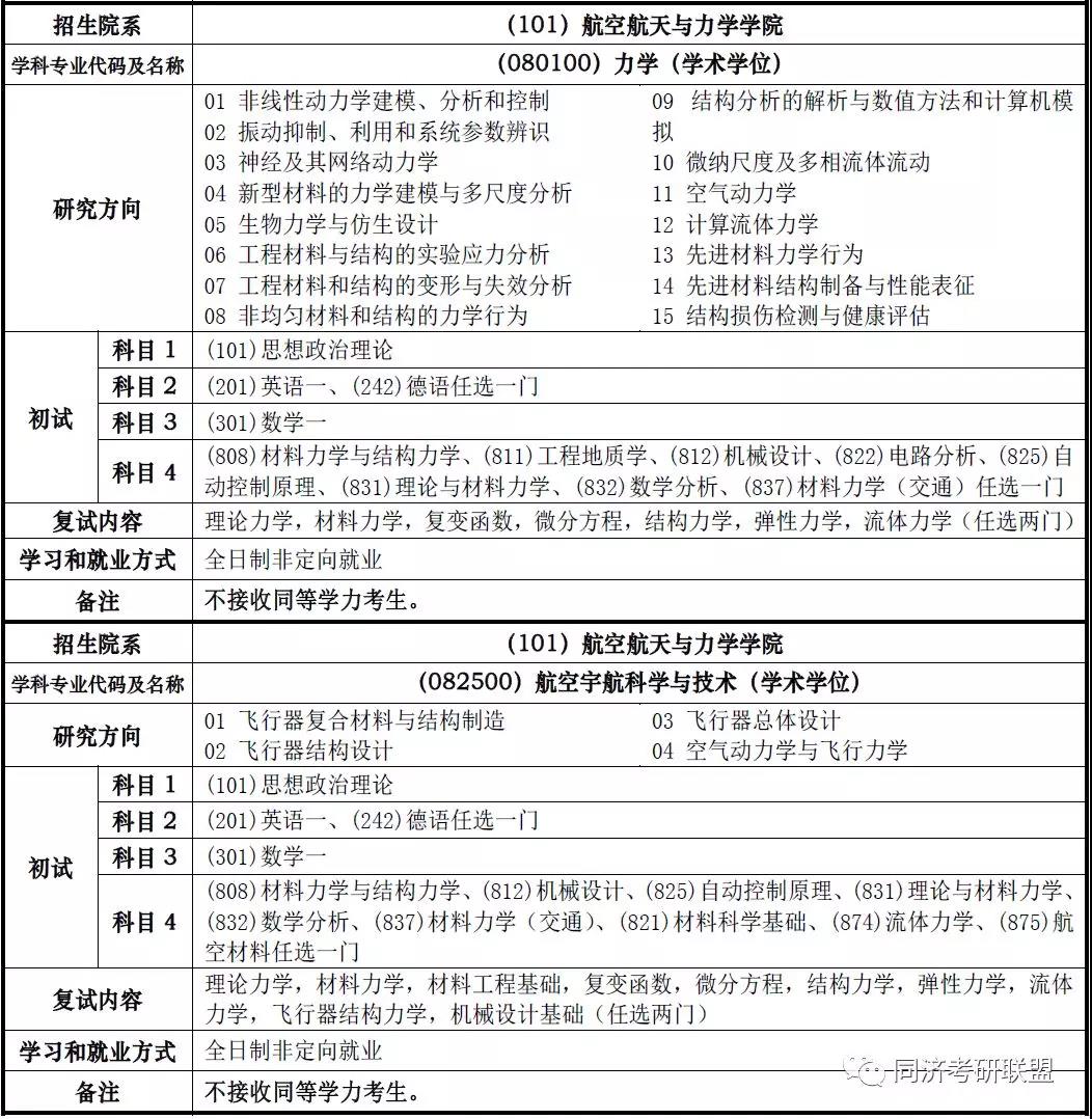 2019年同济大学航空航天与力学学院考研招生专业、考试科目