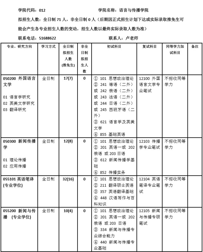 语言与传播学院设有英语语言文学系、欧亚语言文学系、传播学系、大学英语教学部、研究生英语教学部、翻译硕士(MTI)教育中心、外语媒体中心等教学(教辅)机构,建有语言研究中心、外国文学研究中心、翻译研究中心、传播学研究中心和文化产业研究中心等研究机构,共有教职工130余人,在校本科生和研究生近500人。