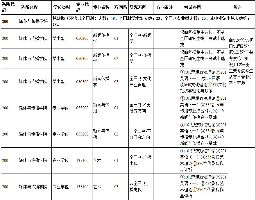 学院下设新闻与传播系、电影电视系、设计系、文化产业管理系,现有数字新闻与传播、广播影视编导、视觉传达艺术设计、景观与环境艺术设计、工业设计、文化产业管理等6个本科专业(及方向);传播学、新闻学、广播电视艺术学、设计艺术学和美术学等5个硕士点;工业设计工程硕士、数字媒体艺术与技术工程硕士、传媒EMBA、MFA(艺术专业硕士)、新闻传播专业硕士等5个专业硕士点;新媒体传播与管理、设计科学与工程两个交叉学科博士点;以及文化产业与媒介管理二级博士点。目前在读学生近900人,其中,本科生743人,硕士生331人,博士生102人,以及各个层次的留学生300人左右。