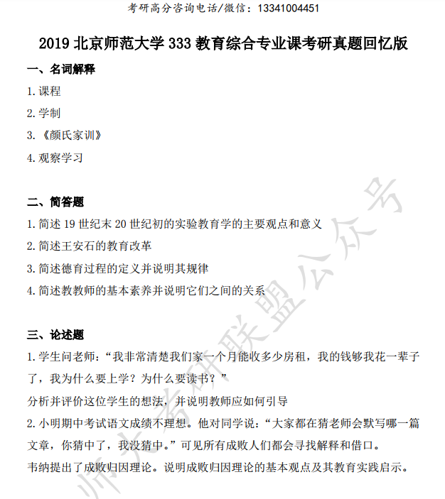 2019北京师范大学333教育综合专业课考研真题回忆版