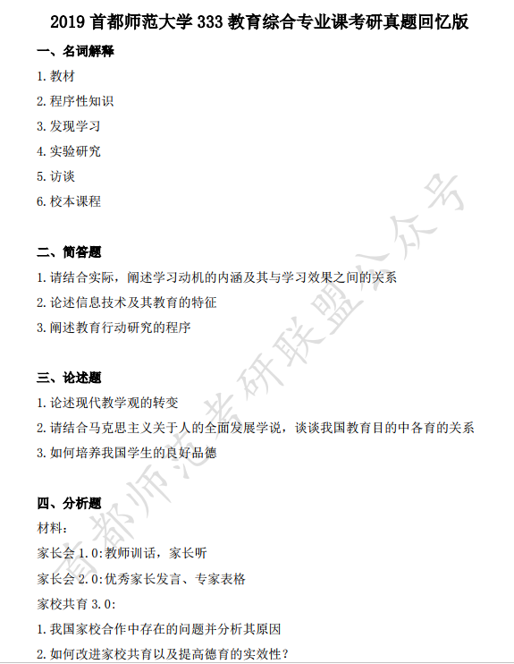 2019首都师范大学333教育综合专业课考研真题回忆版