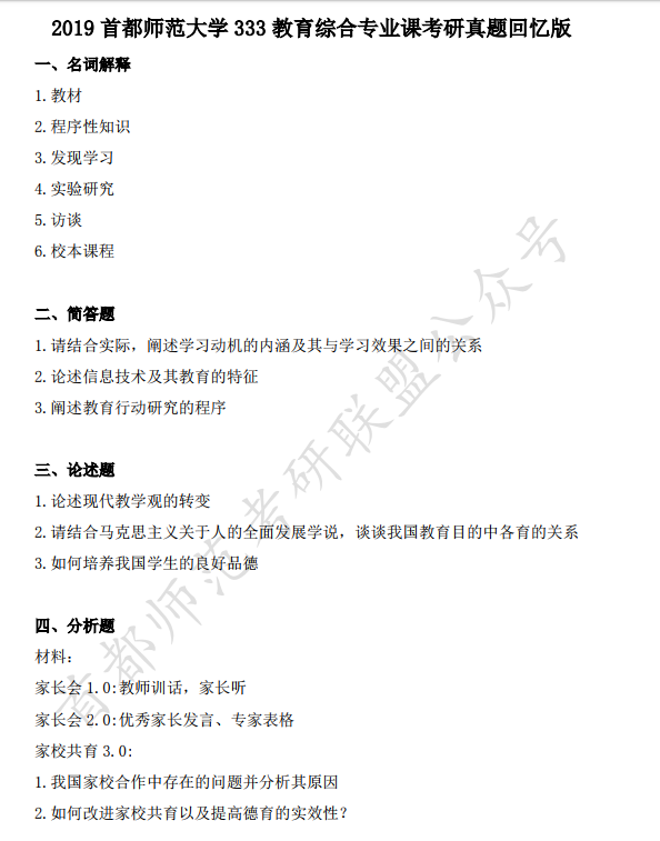 首发|2019首都师范大学333教育综合专业课考研真题回忆版