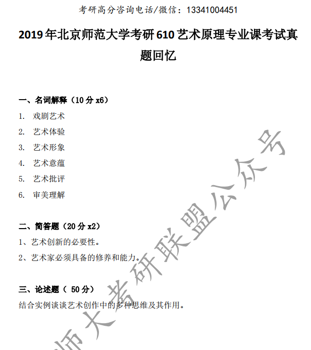 2019年北京师范大学考研610艺术原理专业课考试真题回忆