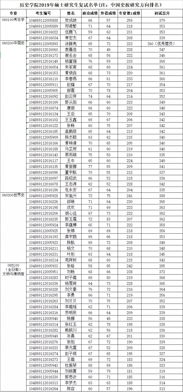 根据研究生院划拨我院2019年硕士生录取指标以及考生初试成绩、专业的设置等各方面的情况,确定历史学院分数线如下(进入复试名单见附件)。