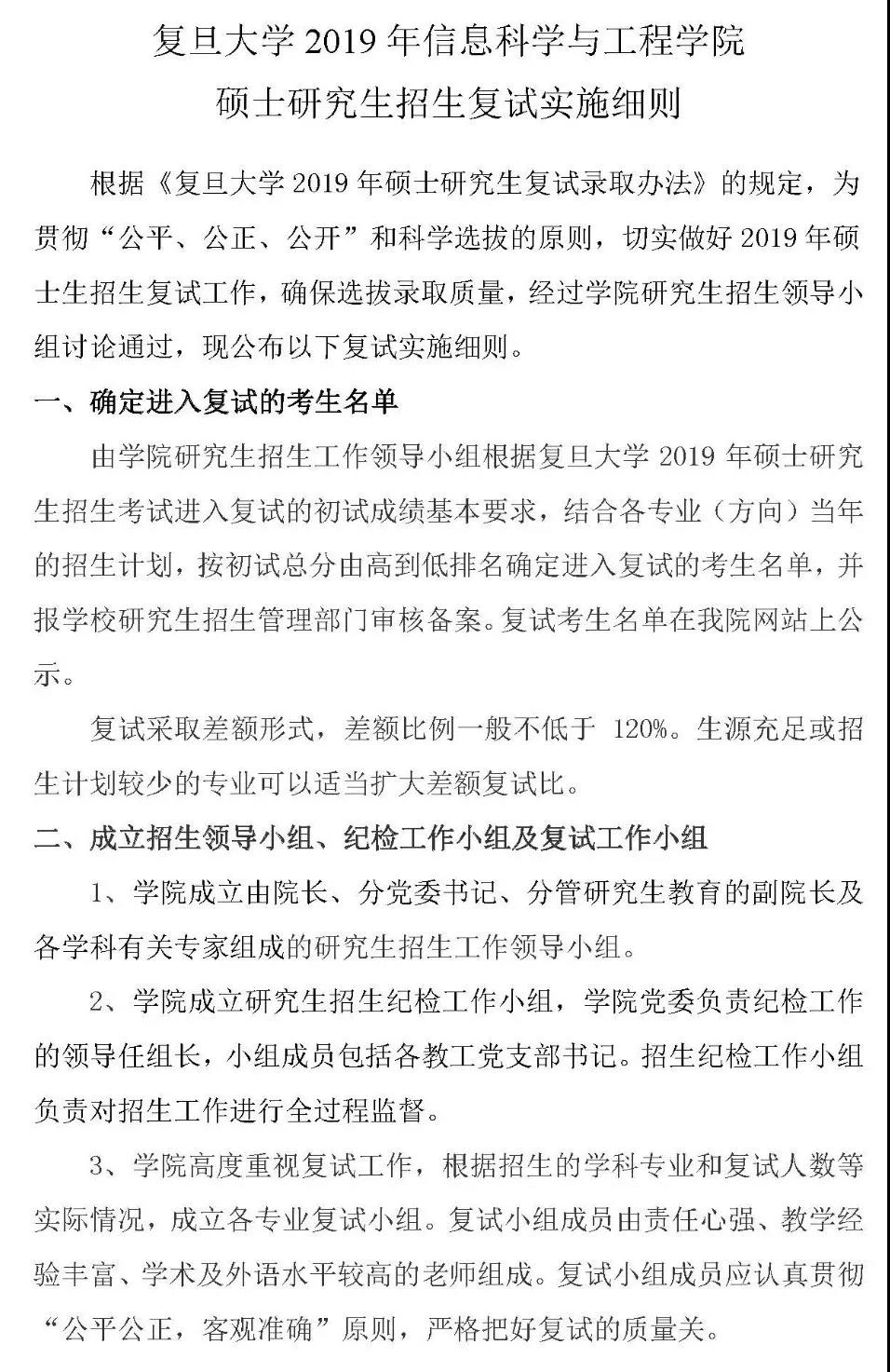 复旦大学信息科学与工程学院2019年复试名单及复试细则