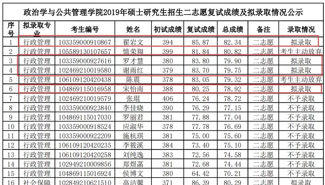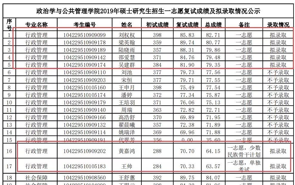 2019年山东大学行政管理专业一志愿及调剂考生拟录取名单公示!