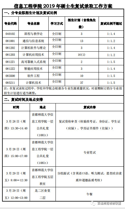 2019年首师大信息工程学院硕士研究生复试录取工作方案