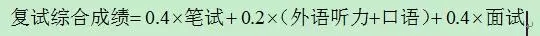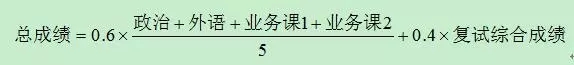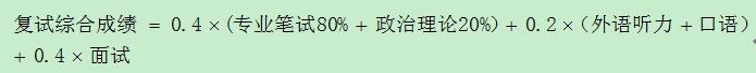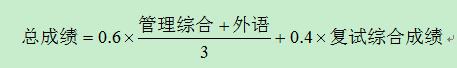 按初试成绩占60%和复试综合成绩占40%计算总成绩,依次排序,以此作为录取的依据。总成绩的计算公式(不含工程管理硕士专业)为: