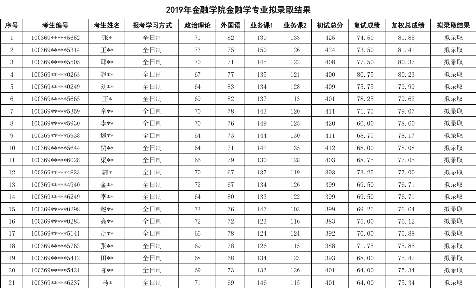 2019年对外经济贸易大学金融学(金融学院)专业硕士研究生拟录取名单