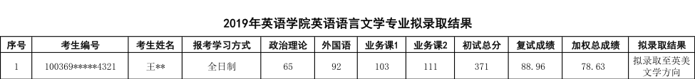 2019年对外经济贸易大学英语语言文学专业硕士研究生拟录取名单