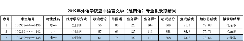 2019年对外经济贸易大学亚非语言文学(越南语方向)专业硕士研究生拟录取名单
