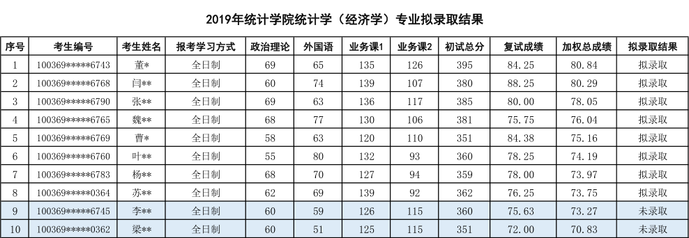 2019年对外经济贸易大学统计学(经济学)专业硕士研究生拟录取名单