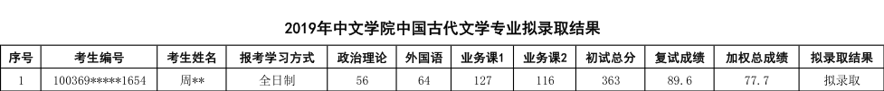 2019年对外经济贸易大学中国古代文学专业硕士研究生拟录取名单