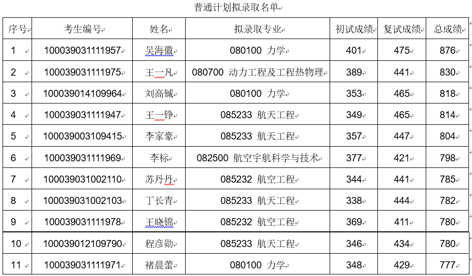 2019年清华大学航天航空学院统考硕士拟录取名单