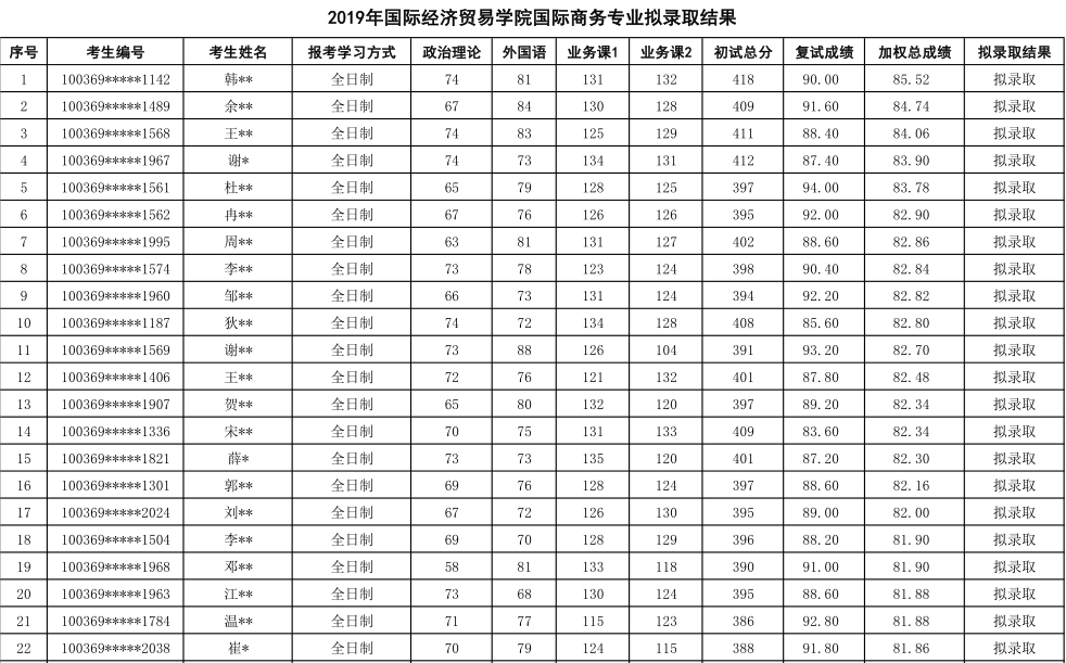 2019年对外经济贸易大学国际商务硕士专业研究生拟录取名单