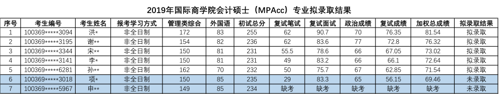 2019年对外经济贸易大学会计硕士(MPAcc非全日制)专业研究生拟录取名单
