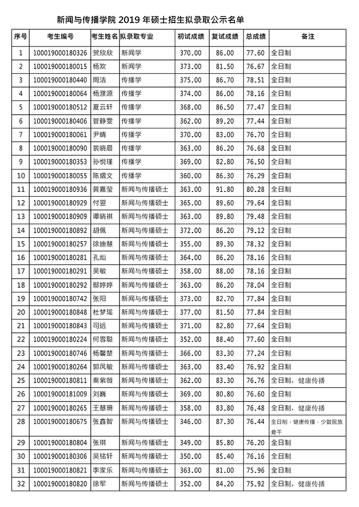 2019年北大新闻与传播学院硕士招生拟录取公示名单
